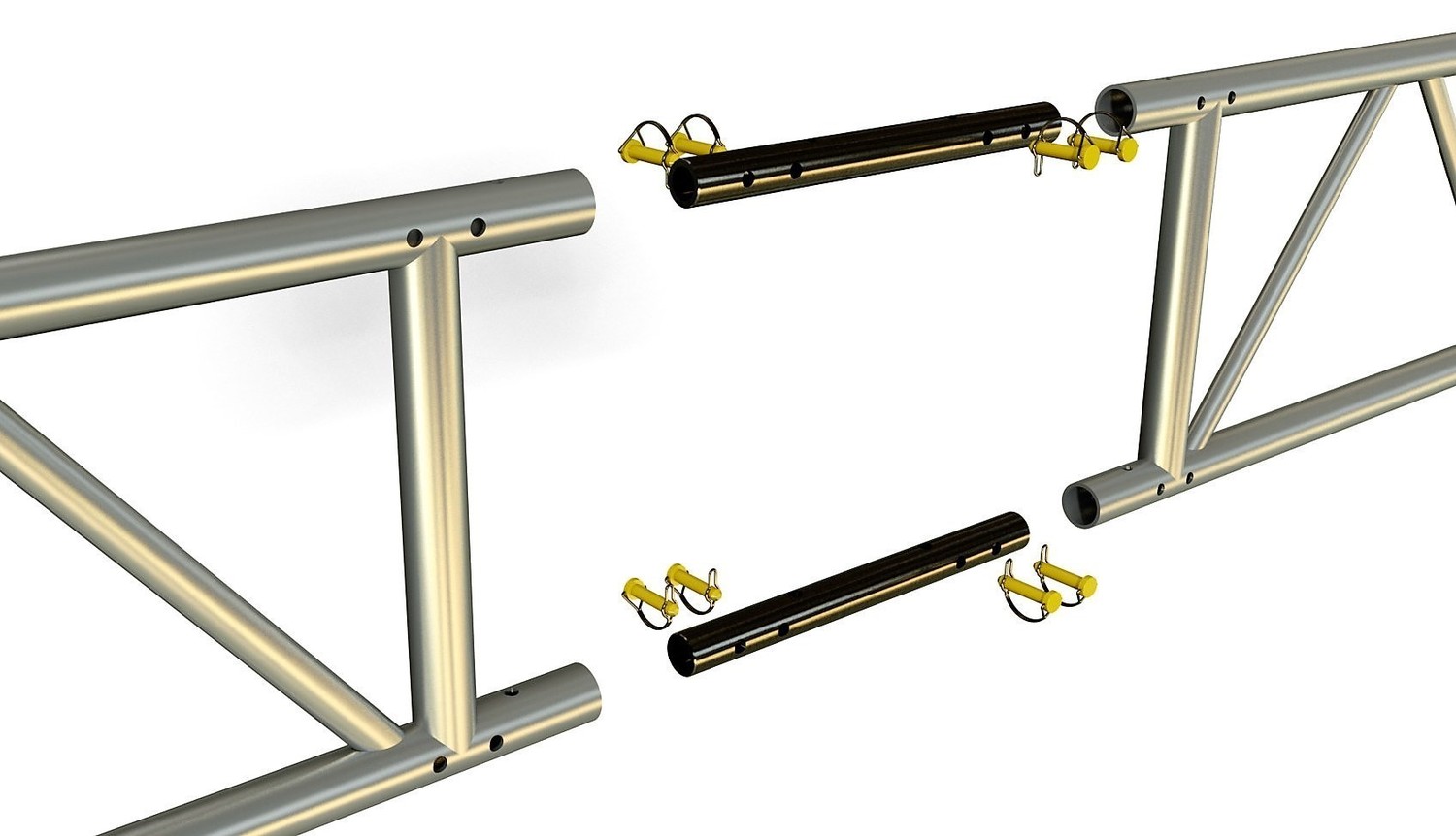 The 750mm N2 Lattice Beams are constructed out of 48.3mm diameter by 4.4mm wall thickness in 6082-T6 aluminum tubes. Beam lengths are generally in 1m increments up to 7m and sections can be connected together using 38.1mm diameter x 6mm thick spigot connectors in pairs using 2 x M12 bolts or spring clips,
